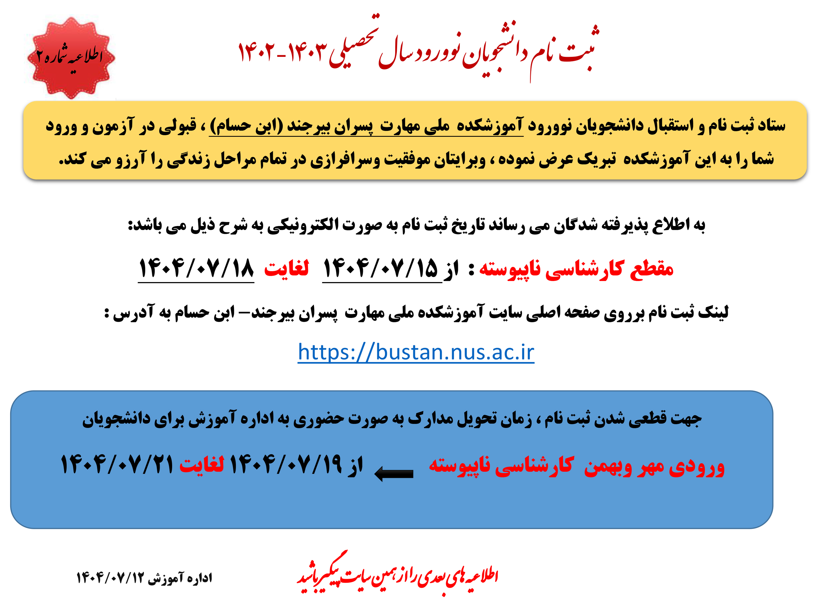 ثبت نام دانشجویان نوورود سال تحصیلی 1405-1404 ستاد ثبت نام و استقبال دانشجویان نوورود دانشگاه ملی مهارت واحد پسران بیرجند (ابن حسام) ، قبولی در آزمون و ورود شما را به این دانشگاه تبریک عرض نموده ، وبرایتان موفقیت وسرافرازی در تمام مراحل زندگی را آرزو می کند.